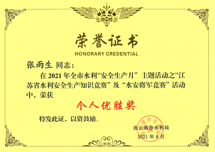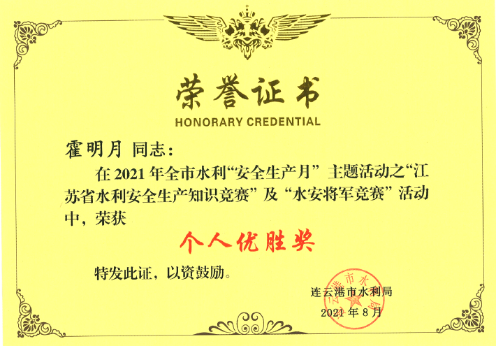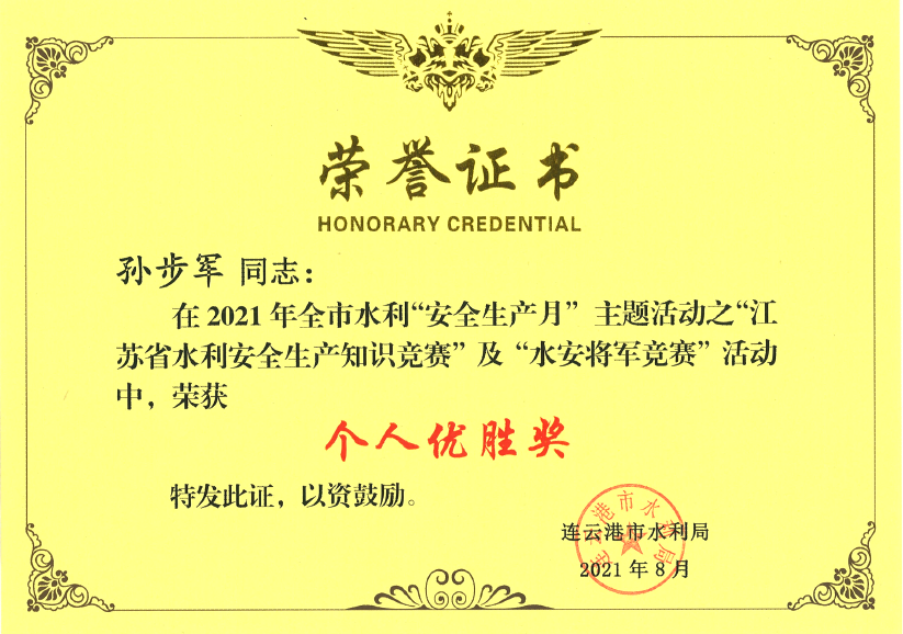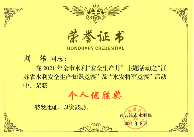 公司在2021年江蘇省水利安全生產(chǎn)知識(shí)競(jìng)賽及水安將軍競(jìng)賽活動(dòng)中精心組織,廣泛動(dòng)員,周密部署,全體員工積極參加競(jìng)賽活動(dòng),取得較好成績(jī),獲得連云港市水利局水利安全生產(chǎn)知識(shí)競(jìng)賽“單位組織獎(jiǎng)”和個(gè)人優(yōu)勝獎(jiǎng)表彰:劉培、孫步軍、張雨生、霍明月。