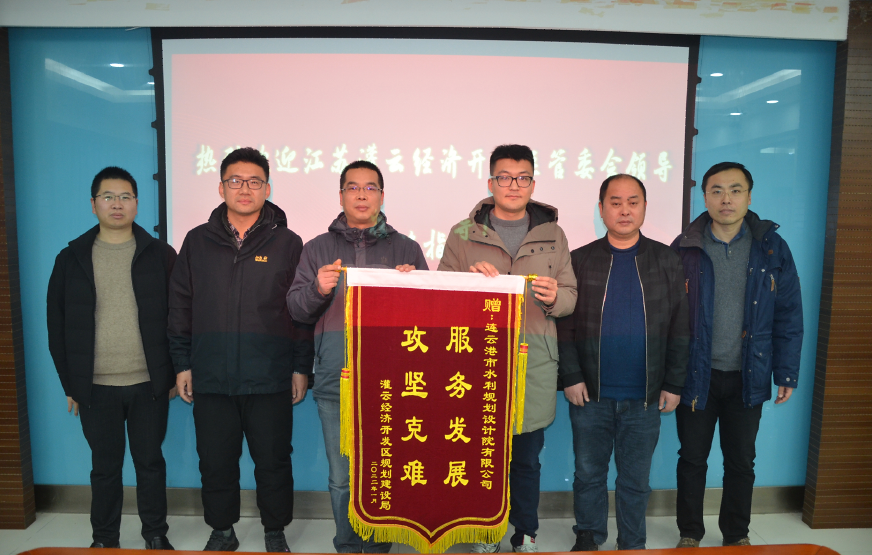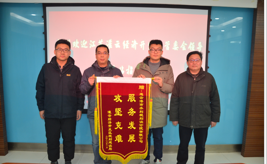 2022年1月6日,江蘇灌云經(jīng)濟(jì)技術(shù)開發(fā)區(qū)李亮主任、孫佳佳局長、尹繼春局長一行三人,為公司送來錦旗,感謝公司幫灌云開發(fā)區(qū)解決項目難題,支持開發(fā)區(qū)發(fā)展。公司梁化成董事長、張應(yīng)奎副總經(jīng)理、顏秉龍副總經(jīng)理、董波工程師一同出席交流。